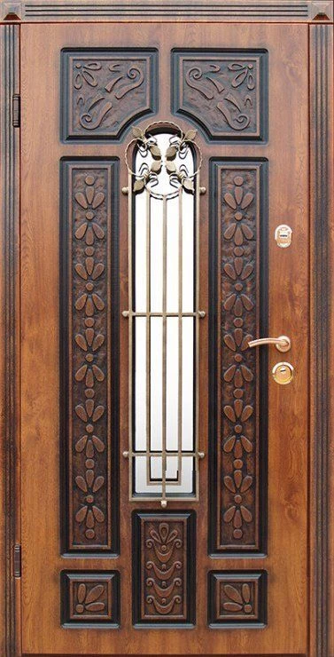 При изготовлении двери с отделкой виноритом на заказ, её можно сделать как глухой, так и декорированную вставками из стекла с элементами ковки. Для установки в дом такую дверь можно сделать с применением терморазрыва, и эта дверь будет надежно сохранять в доме тепло, не промерзая и не конденсируя.